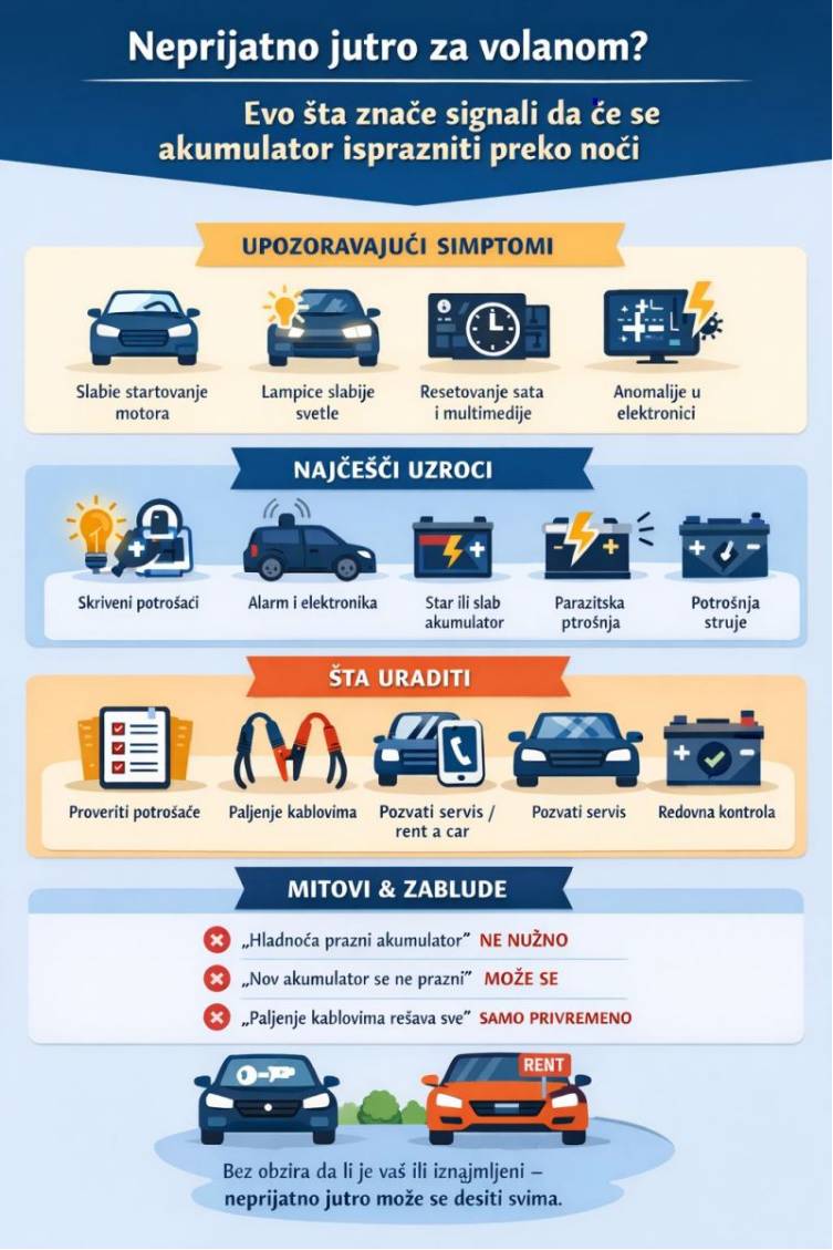 Pražnjenje akumulatora preko noći je čest izazov, ali u većini slučajeva potpuno rešiv uz pravilnu dijagnostiku i pažnju.